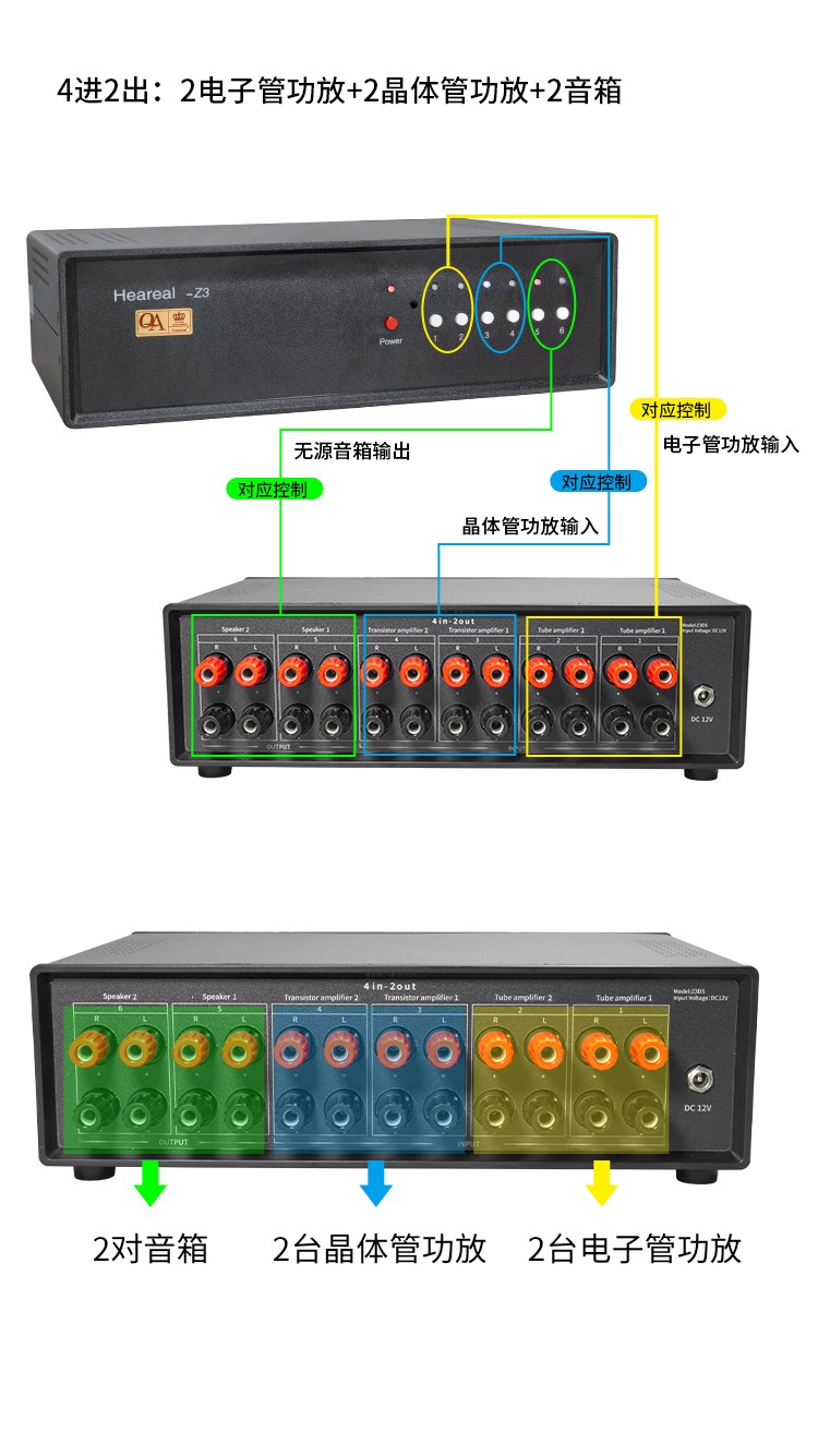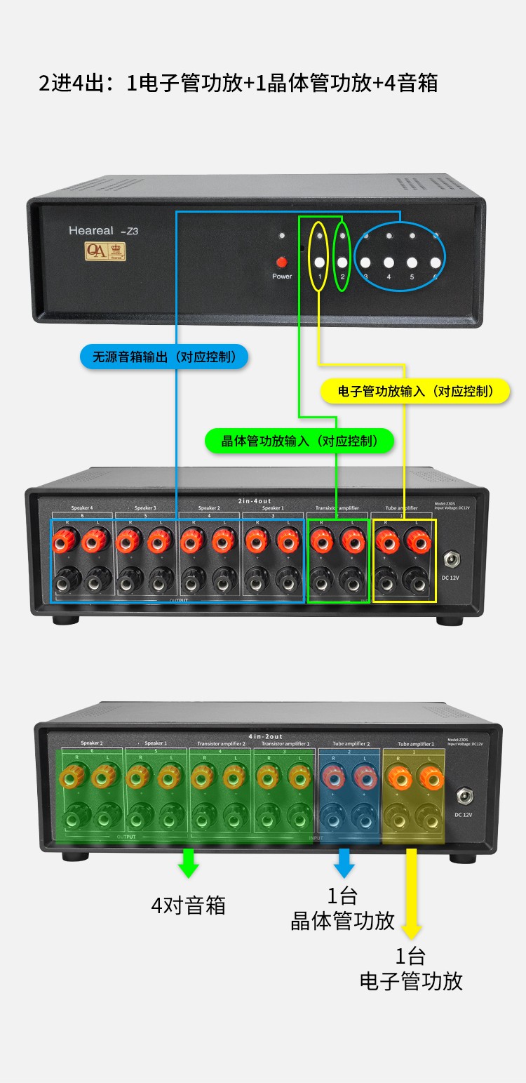 欢聆Z3 音箱功放喇叭切换器大功率 4进2出二进四出无源音箱双声道转换器